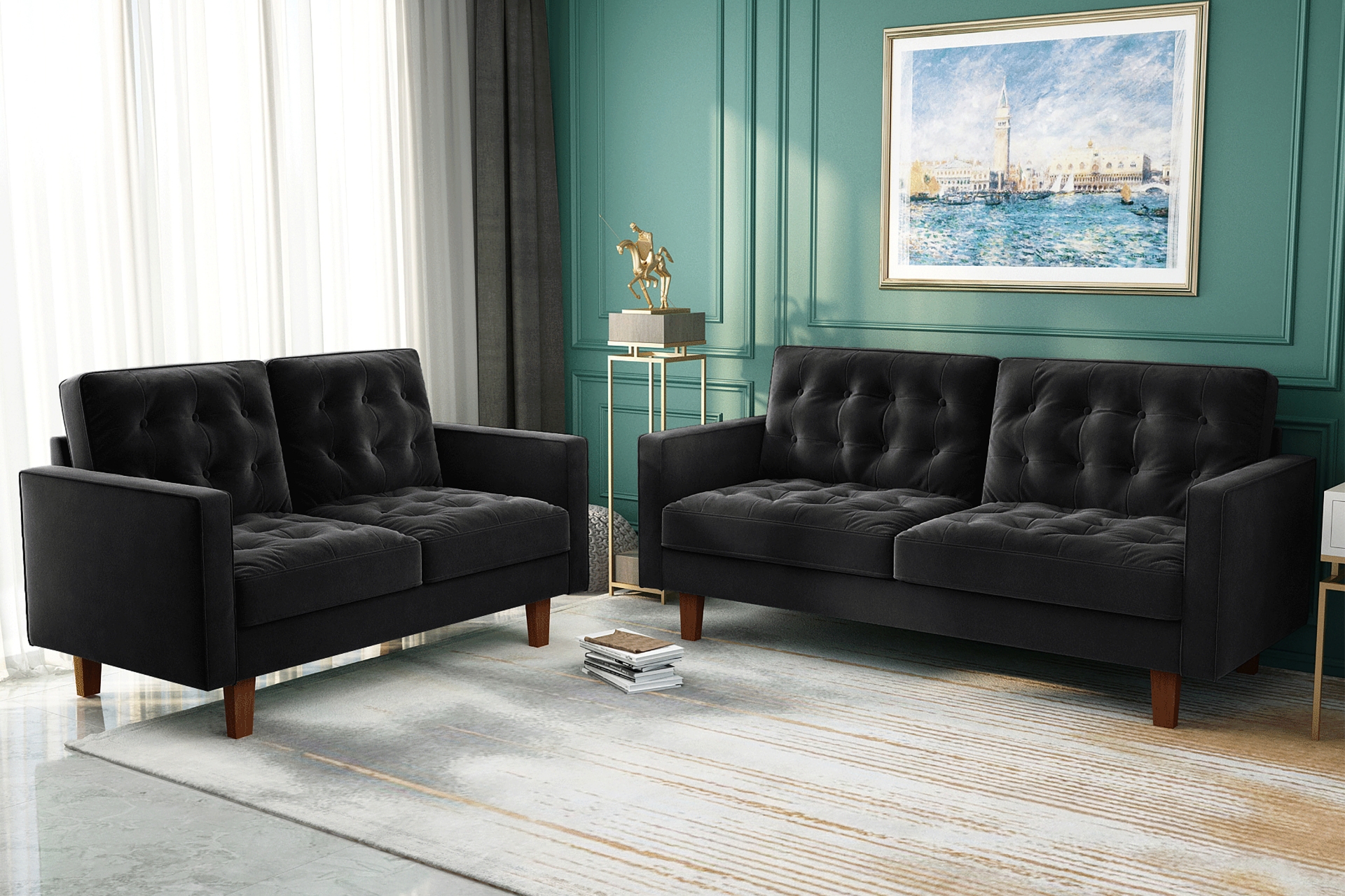 The MILIOU Sofa Set is a mix between mid-century and a refined retro style with its classic lines. It has a tufted design supported with a wooden legs. It comprises a 2 & 3 seater. It is upholstered in 9 attractive colours, each sofa has two smooth back cushions (held in place by velcro) with soft and comfy button detailing.