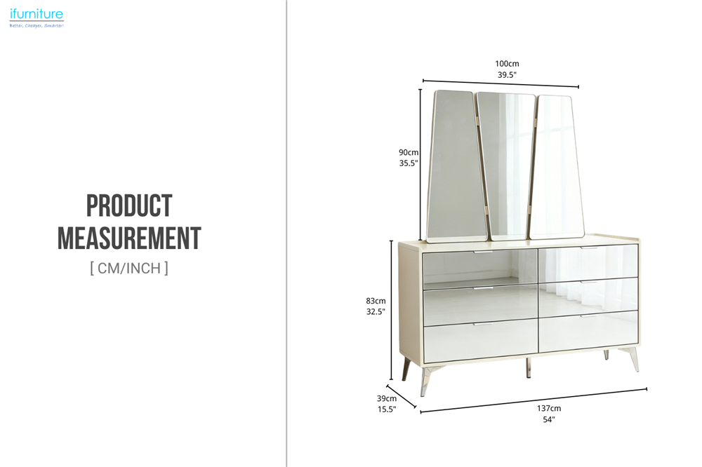 • Premium Construction: Sturdy metal legs and sleek aluminium handles enhance the dresser’s stability and style.