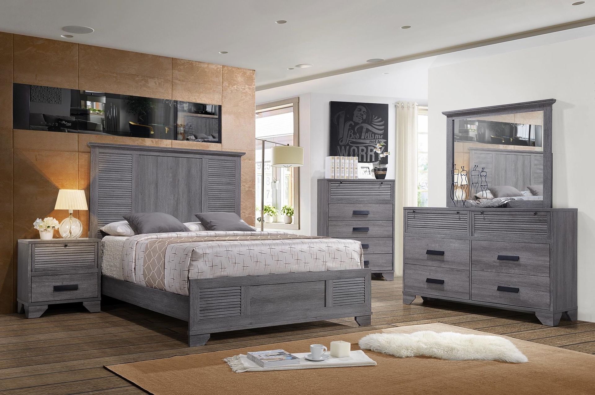 5PC SET INCLUDES: BED FRAME, NIGHTSTAND, CHEST, DRESSING TABLE, MIRROR