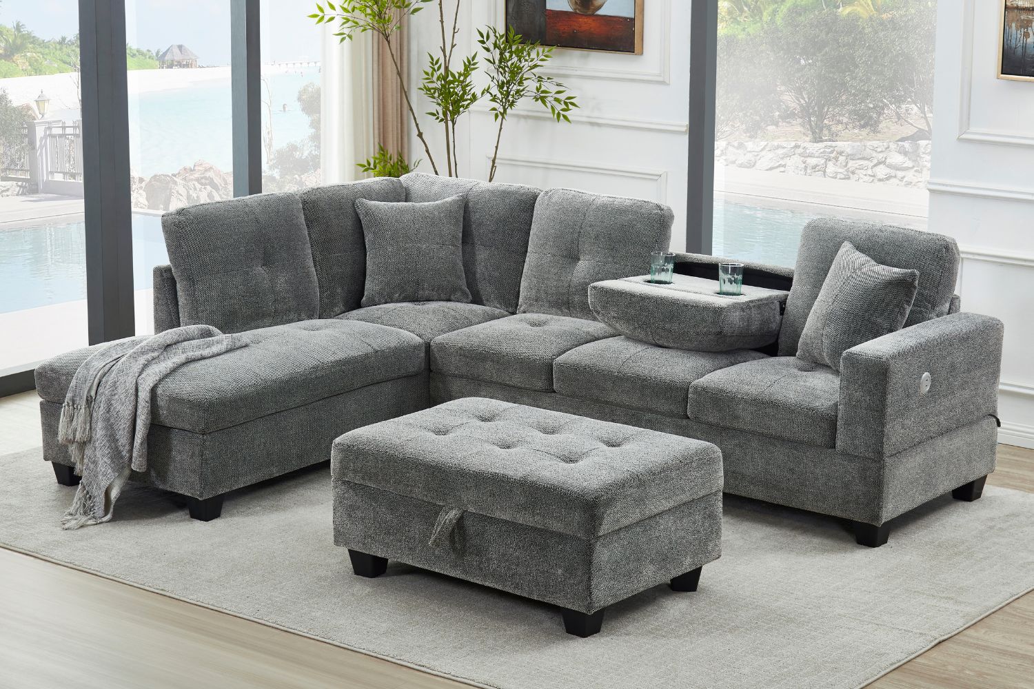 Upgrade your space with the NEBULA sectional sofa. Featuring a moveable ottoman, drop-down console and USB port, it's perfect for gatherings. Choose from dark/misty grey upholstery and left/right chaise options for flexibility. With smooth fabric and small pillows, it's both comfortable and durable.
