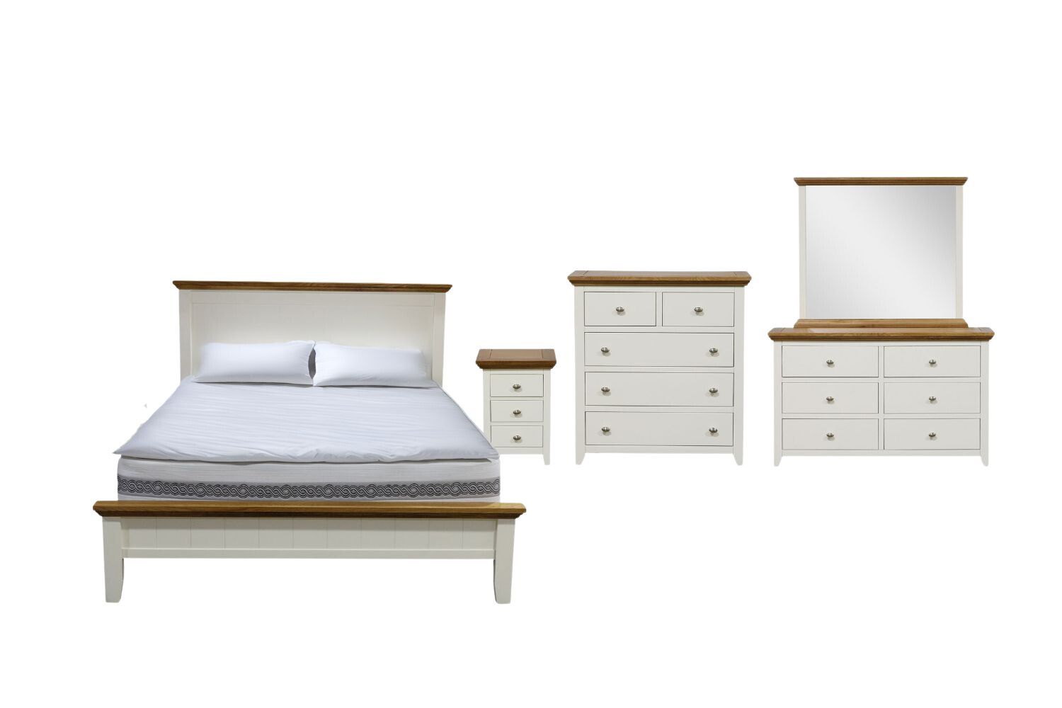 The NOTTINGHAM 5PC Solid Oak Wood Bedroom Combo Set in Queen/Eastern King Size (White), exudes elegance with its refined white finish. Its modern appeal is enhanced by a low footboard design, while the included slats ensure excellent mattress support. In addition to bedside tables boasting three drawers each with durable dove-tailed joints and smooth runners for seamless functionality, the set also includes a dresser with mirror. Polished handles adorn the bedside table and the 5-drawer chest, which offers stylish and convenient storage. Crafted from solid oak and oak veneer, this set combines quality craftsmanship and contemporary design to elevate any bedroom decor, offering both style and practicality.
