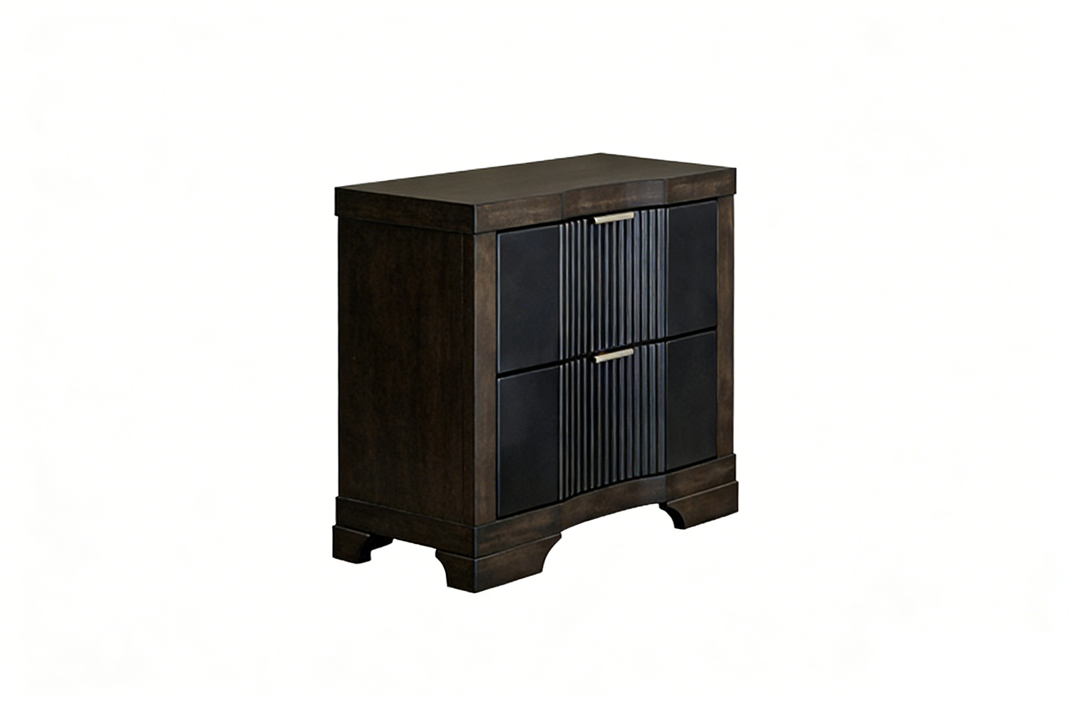 This night stand features two spacious drawers for ample storage and distinctive ribbed detailing. The sleek, dark finish and brushed metal handles add a modern, refined touch, making it a versatile addition to any bedroom.