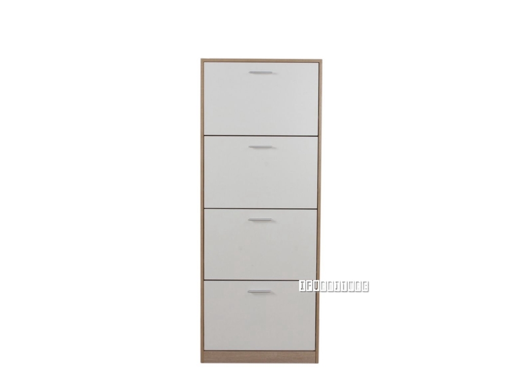 The SLIMLINE153 white matt 4 flap shoe cabinet is ideal for serious space savers.Each fold-open flap holds one layer of shoes, which keeps the unit very shallow.Holes are pre-drilled, and screws and wall plugs included, to secure the unit and prevent it tipping over. The flaps are in matt white, frame in a light wood grain finish